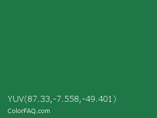 YUV 87.33,-7.558,-49.401 Color is a dark green color and the nearest color is Dark Spring Green #177245. Hex code #1f7748 and RGB value is rgb(31,119,72). In RGB color space, this color is composed of 12% red, 47% green, 28% blue, In CMYK color space, this color is composed of 74% cyan, 0% magenta, 39% yellow , 53% black , In HSL color space, this color has a hue angle of 148° , 59% saturation and 29% lightness.