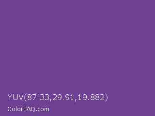 YUV 87.33,29.91,19.882 Color is a normal purple color and the nearest color is Affair #714693. Hex code #6e4094 and RGB value is rgb(110,64,148). In RGB color space, this color is composed of 43% red, 25% green, 58% blue, In CMYK color space, this color is composed of 26% cyan, 57% magenta, 0% yellow , 42% black , In HSL color space, this color has a hue angle of 273° , 40% saturation and 42% lightness.