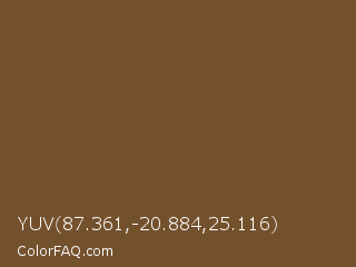 YUV 87.361,-20.884,25.116 Color is a normal orange color and the nearest color is Old Copper #724a2f. Hex code #74512d and RGB value is rgb(116,81,45). In RGB color space, this color is composed of 45% red, 32% green, 18% blue, In CMYK color space, this color is composed of 0% cyan, 30% magenta, 61% yellow , 55% black , In HSL color space, this color has a hue angle of 30° , 44% saturation and 32% lightness.