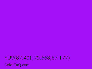 YUV 87.401,79.668,67.177 Color is a normal purple color and the nearest color is Veronica #a020f0. Hex code #a411f9 and RGB value is rgb(164,17,249). In RGB color space, this color is composed of 64% red, 7% green, 98% blue, In CMYK color space, this color is composed of 34% cyan, 93% magenta, 0% yellow , 2% black , In HSL color space, this color has a hue angle of 278° , 95% saturation and 52% lightness.