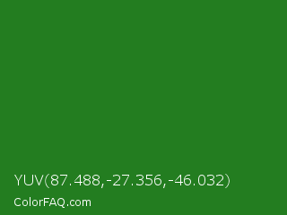 YUV 87.488,-27.356,-46.032 Color is a normal green color and the nearest color is Forest Green #228b22. Hex code #237d20 and RGB value is rgb(35,125,32). In RGB color space, this color is composed of 14% red, 49% green, 13% blue, In CMYK color space, this color is composed of 72% cyan, 0% magenta, 74% yellow , 51% black , In HSL color space, this color has a hue angle of 118° , 59% saturation and 31% lightness.
