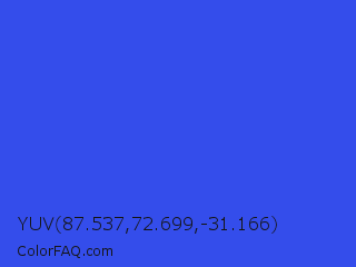 YUV 87.537,72.699,-31.166 Color is a normal blue color and the nearest color is Palatinate Blue #273be2. Hex code #344deb and RGB value is rgb(52,77,235). In RGB color space, this color is composed of 20% red, 30% green, 92% blue, In CMYK color space, this color is composed of 78% cyan, 67% magenta, 0% yellow , 8% black , In HSL color space, this color has a hue angle of 232° , 82% saturation and 56% lightness.