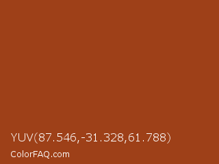 YUV 87.546,-31.328,61.788 Color is a normal orange color and the nearest color is Cognac #9f381d. Hex code #9e4018 and RGB value is rgb(158,64,24). In RGB color space, this color is composed of 62% red, 25% green, 9% blue, In CMYK color space, this color is composed of 0% cyan, 59% magenta, 85% yellow , 38% black , In HSL color space, this color has a hue angle of 18° , 74% saturation and 36% lightness.