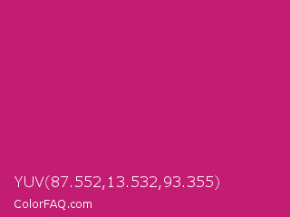 YUV 87.552,13.532,93.355 Color is a normal rose color and the nearest color is Magenta Dye #ca1f7b. Hex code #c21c73 and RGB value is rgb(194,28,115). In RGB color space, this color is composed of 76% red, 11% green, 45% blue, In CMYK color space, this color is composed of 0% cyan, 86% magenta, 41% yellow , 24% black , In HSL color space, this color has a hue angle of 329° , 75% saturation and 44% lightness.