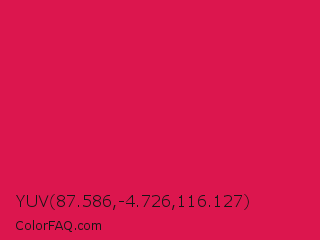 YUV 87.586,-4.726,116.127 Color is a normal rose color and the nearest color is Spanish Crimson #e51a4c. Hex code #dc164e and RGB value is rgb(220,22,78). In RGB color space, this color is composed of 86% red, 9% green, 31% blue, In CMYK color space, this color is composed of 0% cyan, 90% magenta, 65% yellow , 14% black , In HSL color space, this color has a hue angle of 343° , 82% saturation and 47% lightness.