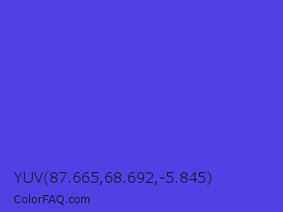 YUV 87.665,68.692,-5.845 Color is a normal indigo color and the nearest color is Majorelle Blue #6050dc. Hex code #5140e3 and RGB value is rgb(81,64,227). In RGB color space, this color is composed of 32% red, 25% green, 89% blue, In CMYK color space, this color is composed of 64% cyan, 72% magenta, 0% yellow , 11% black , In HSL color space, this color has a hue angle of 246° , 74% saturation and 57% lightness.