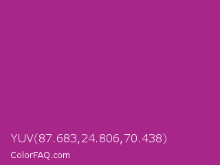 YUV 87.683,24.806,70.438 Color is a normal magenta color and the nearest color is Fandango #b53389. Hex code #a8258a and RGB value is rgb(168,37,138). In RGB color space, this color is composed of 66% red, 15% green, 54% blue, In CMYK color space, this color is composed of 0% cyan, 78% magenta, 18% yellow , 34% black , In HSL color space, this color has a hue angle of 314° , 64% saturation and 40% lightness.