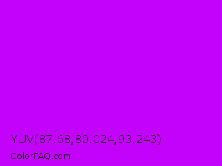 YUV 87.68,80.024,93.243 Color is a normal purple color and the nearest color is Electric Purple #bf00ff. Hex code #c202fa and RGB value is rgb(194,2,250). In RGB color space, this color is composed of 76% red, 1% green, 98% blue, In CMYK color space, this color is composed of 22% cyan, 99% magenta, 0% yellow , 2% black , In HSL color space, this color has a hue angle of 286° , 98% saturation and 49% lightness.