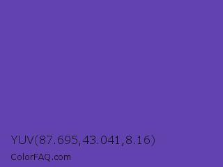 YUV 87.695,43.041,8.16 Color is a normal indigo color and the nearest color is Plump Purple #5946b2. Hex code #6142af and RGB value is rgb(97,66,175). In RGB color space, this color is composed of 38% red, 26% green, 69% blue, In CMYK color space, this color is composed of 45% cyan, 62% magenta, 0% yellow , 31% black , In HSL color space, this color has a hue angle of 257° , 45% saturation and 47% lightness.
