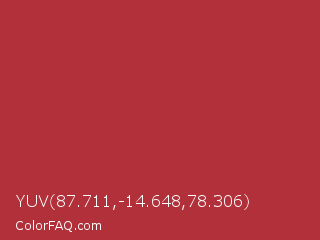 YUV 87.711,-14.648,78.306 Color is a normal red color and the nearest color is Well Read #b43332. Hex code #b1303a and RGB value is rgb(177,48,58). In RGB color space, this color is composed of 69% red, 19% green, 23% blue, In CMYK color space, this color is composed of 0% cyan, 73% magenta, 67% yellow , 31% black , In HSL color space, this color has a hue angle of 355° , 57% saturation and 44% lightness.