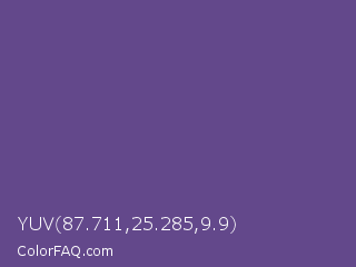YUV 87.711,25.285,9.9 Color is a normal violet color and the nearest color is Butterfly Bush #624e9a. Hex code #63488b and RGB value is rgb(99,72,139). In RGB color space, this color is composed of 39% red, 28% green, 55% blue, In CMYK color space, this color is composed of 29% cyan, 48% magenta, 0% yellow , 45% black , In HSL color space, this color has a hue angle of 264° , 32% saturation and 41% lightness.