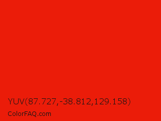YUV 87.727,-38.812,129.158 Color is a normal red color and the nearest color is Scarlet #ff2400. Hex code #eb1c09 and RGB value is rgb(235,28,9). In RGB color space, this color is composed of 92% red, 11% green, 4% blue, In CMYK color space, this color is composed of 0% cyan, 88% magenta, 96% yellow , 8% black , In HSL color space, this color has a hue angle of 5° , 93% saturation and 48% lightness.