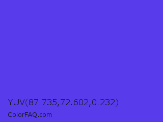 YUV 87.735,72.602,0.232 Color is a normal indigo color and the nearest color is Majorelle Blue #6050dc. Hex code #583beb and RGB value is rgb(88,59,235). In RGB color space, this color is composed of 35% red, 23% green, 92% blue, In CMYK color space, this color is composed of 63% cyan, 75% magenta, 0% yellow , 8% black , In HSL color space, this color has a hue angle of 250° , 81% saturation and 58% lightness.