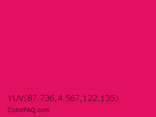 YUV 87.736,4.567,122.135 Color is a normal rose color and the nearest color is Ruby #e0115f. Hex code #e30f61 and RGB value is rgb(227,15,97). In RGB color space, this color is composed of 89% red, 6% green, 38% blue, In CMYK color space, this color is composed of 0% cyan, 93% magenta, 57% yellow , 11% black , In HSL color space, this color has a hue angle of 337° , 88% saturation and 47% lightness.