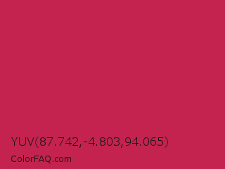 YUV 87.742,-4.803,94.065 Color is a normal rose color and the nearest color is Maroon Flush #c32148. Hex code #c3234e and RGB value is rgb(195,35,78). In RGB color space, this color is composed of 76% red, 14% green, 31% blue, In CMYK color space, this color is composed of 0% cyan, 82% magenta, 60% yellow , 24% black , In HSL color space, this color has a hue angle of 344° , 70% saturation and 45% lightness.
