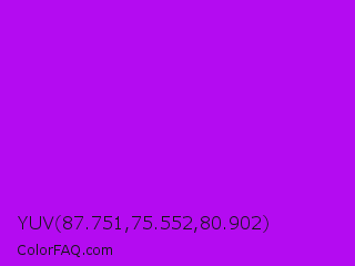 YUV 87.751,75.552,80.902 Color is a normal purple color and the nearest color is Vivid Mulberry #b80ce3. Hex code #b40bf1 and RGB value is rgb(180,11,241). In RGB color space, this color is composed of 71% red, 4% green, 95% blue, In CMYK color space, this color is composed of 25% cyan, 95% magenta, 0% yellow , 5% black , In HSL color space, this color has a hue angle of 284° , 91% saturation and 49% lightness.