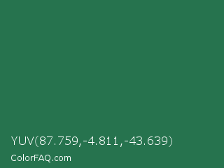 YUV 87.759,-4.811,-43.639 Color is a dark green color and the nearest color is Dark Spring Green #177245. Hex code #26734e and RGB value is rgb(38,115,78). In RGB color space, this color is composed of 15% red, 45% green, 31% blue, In CMYK color space, this color is composed of 67% cyan, 0% magenta, 32% yellow , 55% black , In HSL color space, this color has a hue angle of 151° , 50% saturation and 30% lightness.