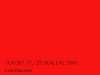 YUV 87.77,-33.904,141.399 Color is a normal red color and the nearest color is Vivid Red #f70d1a. Hex code #f91313 and RGB value is rgb(249,19,19). In RGB color space, this color is composed of 98% red, 7% green, 7% blue, In CMYK color space, this color is composed of 0% cyan, 92% magenta, 92% yellow , 2% black , In HSL color space, this color has a hue angle of 0° , 95% saturation and 53% lightness.