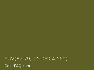 YUV 87.79,-25.039,4.569 Color is a dark yellow color and the nearest color is Antique Bronze #665d1e. Hex code #5d5f25 and RGB value is rgb(93,95,37). In RGB color space, this color is composed of 36% red, 37% green, 15% blue, In CMYK color space, this color is composed of 2% cyan, 0% magenta, 61% yellow , 63% black , In HSL color space, this color has a hue angle of 62° , 44% saturation and 26% lightness.