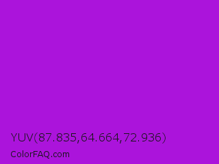 YUV 87.835,64.664,72.936 Color is a normal purple color and the nearest color is Vivid Mulberry #b80ce3. Hex code #ab14db and RGB value is rgb(171,20,219). In RGB color space, this color is composed of 67% red, 8% green, 86% blue, In CMYK color space, this color is composed of 22% cyan, 91% magenta, 0% yellow , 14% black , In HSL color space, this color has a hue angle of 286° , 83% saturation and 47% lightness.