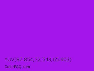 YUV 87.854,72.543,65.903 Color is a normal purple color and the nearest color is Veronica #a020f0. Hex code #a315eb and RGB value is rgb(163,21,235). In RGB color space, this color is composed of 64% red, 8% green, 92% blue, In CMYK color space, this color is composed of 31% cyan, 91% magenta, 0% yellow , 8% black , In HSL color space, this color has a hue angle of 280° , 84% saturation and 50% lightness.