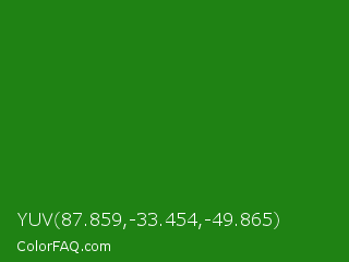 YUV 87.859,-33.454,-49.865 Color is a dark green color and the nearest color is Forest Green #228b22. Hex code #1f8214 and RGB value is rgb(31,130,20). In RGB color space, this color is composed of 12% red, 51% green, 8% blue, In CMYK color space, this color is composed of 76% cyan, 0% magenta, 85% yellow , 49% black , In HSL color space, this color has a hue angle of 114° , 73% saturation and 29% lightness.