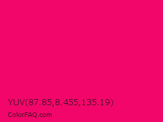 YUV 87.85,8.455,135.19 Color is a normal rose color and the nearest color is Vivid Raspberry #ff006c. Hex code #f20669 and RGB value is rgb(242,6,105). In RGB color space, this color is composed of 95% red, 2% green, 41% blue, In CMYK color space, this color is composed of 0% cyan, 98% magenta, 57% yellow , 5% black , In HSL color space, this color has a hue angle of 335° , 95% saturation and 49% lightness.