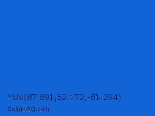 YUV 87.891,62.172,-61.294 Color is a normal blue color and the nearest color is Bright Navy Blue #1974d2. Hex code #1263d6 and RGB value is rgb(18,99,214). In RGB color space, this color is composed of 7% red, 39% green, 84% blue, In CMYK color space, this color is composed of 92% cyan, 54% magenta, 0% yellow , 16% black , In HSL color space, this color has a hue angle of 215° , 84% saturation and 45% lightness.