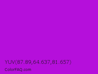 YUV 87.89,64.637,81.657 Color is a normal purple color and the nearest color is Vivid Mulberry #b80ce3. Hex code #b50fdb and RGB value is rgb(181,15,219). In RGB color space, this color is composed of 71% red, 6% green, 86% blue, In CMYK color space, this color is composed of 17% cyan, 93% magenta, 0% yellow , 14% black , In HSL color space, this color has a hue angle of 289° , 87% saturation and 46% lightness.