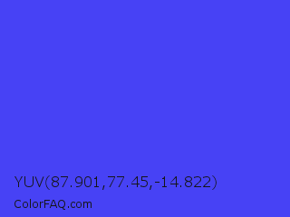 YUV 87.901,77.45,-14.822 Color is a light indigo color and the nearest color is Ultramarine Blue #4166f5. Hex code #4742f5 and RGB value is rgb(71,66,245). In RGB color space, this color is composed of 28% red, 26% green, 96% blue, In CMYK color space, this color is composed of 71% cyan, 73% magenta, 0% yellow , 4% black , In HSL color space, this color has a hue angle of 242° , 90% saturation and 61% lightness.