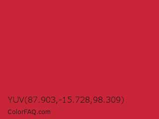 YUV 87.903,-15.728,98.309 Color is a normal red color and the nearest color is Cardinal #c41e3a. Hex code #c82538 and RGB value is rgb(200,37,56). In RGB color space, this color is composed of 78% red, 15% green, 22% blue, In CMYK color space, this color is composed of 0% cyan, 82% magenta, 72% yellow , 22% black , In HSL color space, this color has a hue angle of 353° , 69% saturation and 46% lightness.