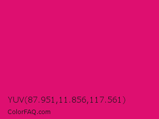 YUV 87.951,11.856,117.561 Color is a normal rose color and the nearest color is Dogwood Rose #d71868. Hex code #de0f70 and RGB value is rgb(222,15,112). In RGB color space, this color is composed of 87% red, 6% green, 44% blue, In CMYK color space, this color is composed of 0% cyan, 93% magenta, 50% yellow , 13% black , In HSL color space, this color has a hue angle of 332° , 87% saturation and 46% lightness.
