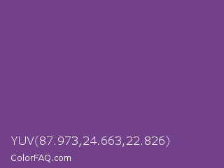 YUV 87.973,24.663,22.826 Color is a normal purple color and the nearest color is Affair #714693. Hex code #72418a and RGB value is rgb(114,65,138). In RGB color space, this color is composed of 45% red, 25% green, 54% blue, In CMYK color space, this color is composed of 17% cyan, 53% magenta, 0% yellow , 46% black , In HSL color space, this color has a hue angle of 280° , 36% saturation and 40% lightness.