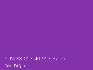 YUV 88.013,40.913,37.7 Color is a normal purple color and the nearest color is Grape #6f2da8. Hex code #8332ab and RGB value is rgb(131,50,171). In RGB color space, this color is composed of 51% red, 20% green, 67% blue, In CMYK color space, this color is composed of 23% cyan, 71% magenta, 0% yellow , 33% black , In HSL color space, this color has a hue angle of 280° , 55% saturation and 43% lightness.