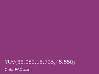 YUV 88.053,16.736,45.558 Color is a normal magenta color and the nearest color is Razzmic Berry Crayola #843179. Hex code #8c377a and RGB value is rgb(140,55,122). In RGB color space, this color is composed of 55% red, 22% green, 48% blue, In CMYK color space, this color is composed of 0% cyan, 61% magenta, 13% yellow , 45% black , In HSL color space, this color has a hue angle of 313° , 44% saturation and 38% lightness.