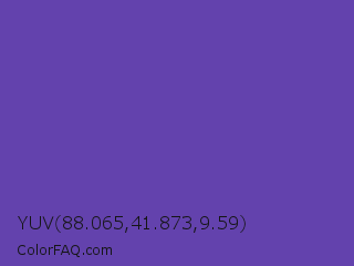 YUV 88.065,41.873,9.59 Color is a normal indigo color and the nearest color is Plump Purple #5946b2. Hex code #6342ad and RGB value is rgb(99,66,173). In RGB color space, this color is composed of 39% red, 26% green, 68% blue, In CMYK color space, this color is composed of 43% cyan, 62% magenta, 0% yellow , 32% black , In HSL color space, this color has a hue angle of 259° , 45% saturation and 47% lightness.
