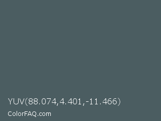 YUV 88.074,4.401,-11.466 Color is a normal cyan color and the nearest color is Deep Space Sparkle #4a646c. Hex code #4b5d61 and RGB value is rgb(75,93,97). In RGB color space, this color is composed of 29% red, 36% green, 38% blue, In CMYK color space, this color is composed of 23% cyan, 4% magenta, 0% yellow , 62% black , In HSL color space, this color has a hue angle of 191° , 13% saturation and 34% lightness.
