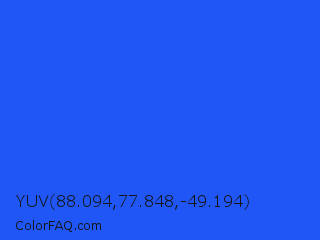 YUV 88.094,77.848,-49.194 Color is a normal blue color and the nearest color is Blue Crayola #1f75fe. Hex code #2056f6 and RGB value is rgb(32,86,246). In RGB color space, this color is composed of 13% red, 34% green, 96% blue, In CMYK color space, this color is composed of 87% cyan, 65% magenta, 0% yellow , 4% black , In HSL color space, this color has a hue angle of 225° , 92% saturation and 55% lightness.