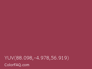 YUV 88.098,-4.978,56.919 Color is a normal red color and the nearest color is Smoky Topaz #933d41. Hex code #99394e and RGB value is rgb(153,57,78). In RGB color space, this color is composed of 60% red, 22% green, 31% blue, In CMYK color space, this color is composed of 0% cyan, 63% magenta, 49% yellow , 40% black , In HSL color space, this color has a hue angle of 347° , 46% saturation and 41% lightness.