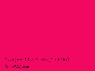 YUV 88.112,4.382,134.96 Color is a normal rose color and the nearest color is Raspberry #e30b5d. Hex code #f20861 and RGB value is rgb(242,8,97). In RGB color space, this color is composed of 95% red, 3% green, 38% blue, In CMYK color space, this color is composed of 0% cyan, 97% magenta, 60% yellow , 5% black , In HSL color space, this color has a hue angle of 337° , 94% saturation and 49% lightness.