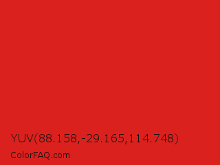 YUV 88.158,-29.165,114.748 Color is a normal red color and the nearest color is Maximum Red #d92121. Hex code #db211d and RGB value is rgb(219,33,29). In RGB color space, this color is composed of 86% red, 13% green, 11% blue, In CMYK color space, this color is composed of 0% cyan, 85% magenta, 87% yellow , 14% black , In HSL color space, this color has a hue angle of 1° , 77% saturation and 49% lightness.