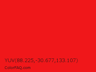YUV 88.225,-30.677,133.107 Color is a normal red color and the nearest color is Red Pigment #ed1c24. Hex code #f0171a and RGB value is rgb(240,23,26). In RGB color space, this color is composed of 94% red, 9% green, 10% blue, In CMYK color space, this color is composed of 0% cyan, 90% magenta, 89% yellow , 6% black , In HSL color space, this color has a hue angle of 359° , 88% saturation and 52% lightness.