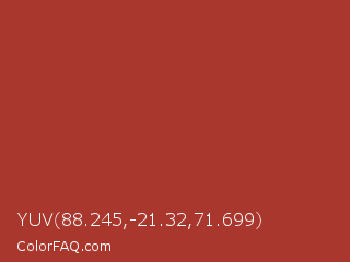 YUV 88.245,-21.32,71.699 Color is a normal red color and the nearest color is Sweet Brown #a83731. Hex code #aa372d and RGB value is rgb(170,55,45). In RGB color space, this color is composed of 67% red, 22% green, 18% blue, In CMYK color space, this color is composed of 0% cyan, 68% magenta, 74% yellow , 33% black , In HSL color space, this color has a hue angle of 5° , 58% saturation and 42% lightness.