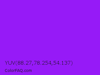 YUV 88.27,78.254,54.137 Color is a normal purple color and the nearest color is Veronica #a020f0. Hex code #961af7 and RGB value is rgb(150,26,247). In RGB color space, this color is composed of 59% red, 10% green, 97% blue, In CMYK color space, this color is composed of 39% cyan, 89% magenta, 0% yellow , 3% black , In HSL color space, this color has a hue angle of 274° , 93% saturation and 54% lightness.