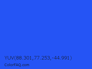 YUV 88.301,77.253,-44.991 Color is a normal blue color and the nearest color is Palatinate Blue #273be2. Hex code #2554f5 and RGB value is rgb(37,84,245). In RGB color space, this color is composed of 15% red, 33% green, 96% blue, In CMYK color space, this color is composed of 85% cyan, 66% magenta, 0% yellow , 4% black , In HSL color space, this color has a hue angle of 226° , 91% saturation and 55% lightness.