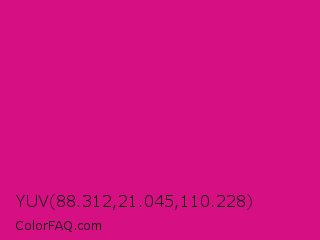 YUV 88.312,21.045,110.228 Color is a normal magenta color and the nearest color is Vivid Cerise #da1d81. Hex code #d61083 and RGB value is rgb(214,16,131). In RGB color space, this color is composed of 84% red, 6% green, 51% blue, In CMYK color space, this color is composed of 0% cyan, 93% magenta, 39% yellow , 16% black , In HSL color space, this color has a hue angle of 325° , 86% saturation and 45% lightness.