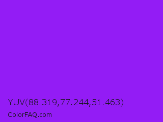YUV 88.319,77.244,51.463 Color is a normal purple color and the nearest color is Veronica #a020f0. Hex code #931cf5 and RGB value is rgb(147,28,245). In RGB color space, this color is composed of 58% red, 11% green, 96% blue, In CMYK color space, this color is composed of 40% cyan, 89% magenta, 0% yellow , 4% black , In HSL color space, this color has a hue angle of 273° , 92% saturation and 54% lightness.