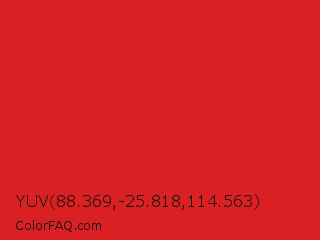 YUV 88.369,-25.818,114.563 Color is a normal red color and the nearest color is Maximum Red #d92121. Hex code #db2024 and RGB value is rgb(219,32,36). In RGB color space, this color is composed of 86% red, 13% green, 14% blue, In CMYK color space, this color is composed of 0% cyan, 85% magenta, 84% yellow , 14% black , In HSL color space, this color has a hue angle of 359° , 75% saturation and 49% lightness.