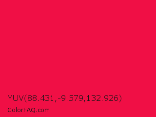 YUV 88.431,-9.579,132.926 Color is a normal red color and the nearest color is Red Ribbon #ed0a3f. Hex code #f00f45 and RGB value is rgb(240,15,69). In RGB color space, this color is composed of 94% red, 6% green, 27% blue, In CMYK color space, this color is composed of 0% cyan, 94% magenta, 71% yellow , 6% black , In HSL color space, this color has a hue angle of 346° , 88% saturation and 50% lightness.
