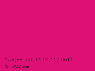YUV 88.521,14.04,117.061 Color is a normal rose color and the nearest color is Red Purple #e40078. Hex code #de0f75 and RGB value is rgb(222,15,117). In RGB color space, this color is composed of 87% red, 6% green, 46% blue, In CMYK color space, this color is composed of 0% cyan, 93% magenta, 47% yellow , 13% black , In HSL color space, this color has a hue angle of 330° , 87% saturation and 46% lightness.